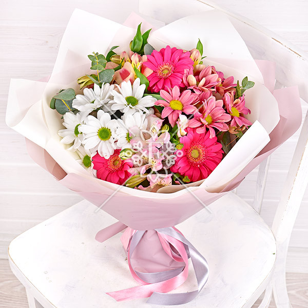 гербера розовая – 3 шт., хризантема розовая кустовая – 1 шт., хризантема  белая кустовая – 1 шт., альстромерия розовая – 2 шт., декоративная зелень: эвкалипт, упаковка, лента.