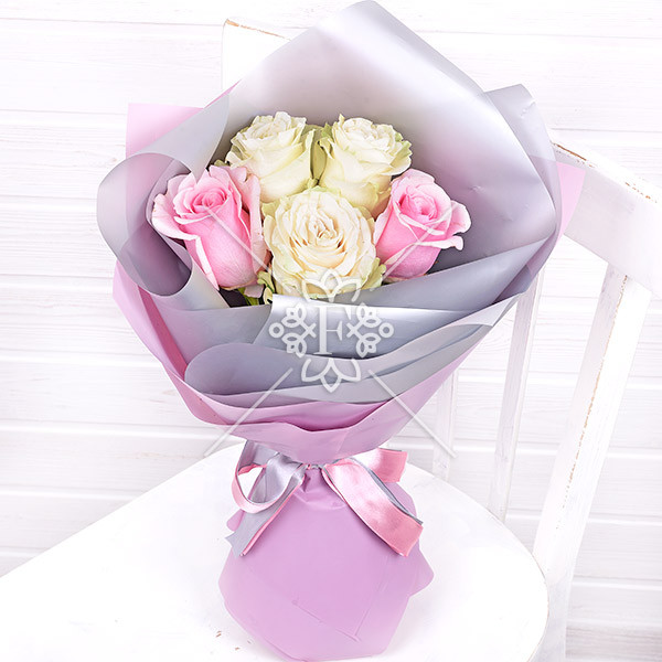 роза розовая и белая (кремовая) – 5 шт., упаковка, лента.