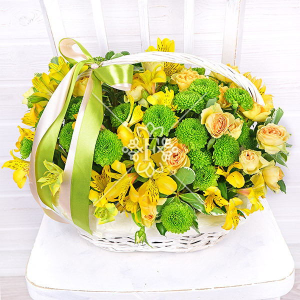 роза желтая кустовая – 5 шт., хризантема зеленая – 5 шт., альстромерия желтая -5 шт., зелень декоративная (питтоспорум), оазис, корзинка, лента