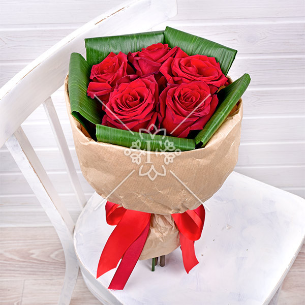 роза красная - 5 шт., зелень декоративная(аспидистра), упаковка, лента.